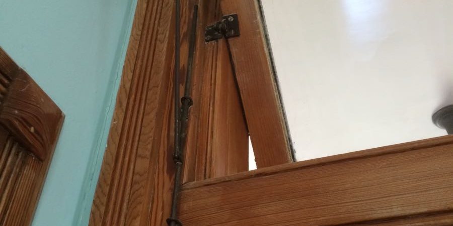 I just walked what seemed to be the oldest house in Cincinnati today! It was amazing! Cracked plaster everywhere, but it was still intact. The rooms had 12′ ceilings and 10′ doors! Here are some photos of the transom windows which was an amazing spectacle. It is a mechanical system that with the pull of the lever, the transom window will change it pitch.