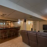 The basement of the house is set up with a theatre darkness to it in the recreation side. The bar, from previous owner, is a simply made site built bar that has a physical sink, but no drainline or water supplies. This has been used as an open sink cooler during entertaining events. The craft room to the right of the basement stairs could be your craft space or a home office. The mechanical room and storage is off of this craft room. It measures approx 8′ x 13′ and has the sump pump in the backleft corner.